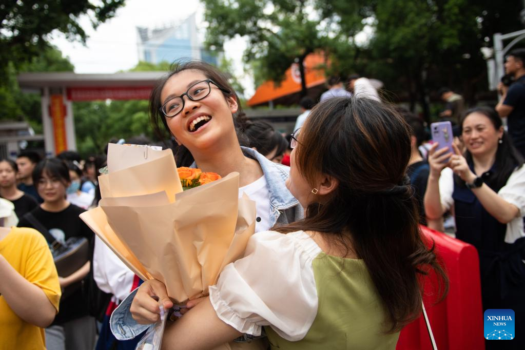 An examinee (L) receives a bunch of flowers from her parent out of an exam site of national college entrance exam in Changsha, central China's Hunan Province, June 9, 2022. The annual exam, better known as the "gaokao," saw a record 11.93 million candidates signing up this year. (Xinhua/Chen Sihan)