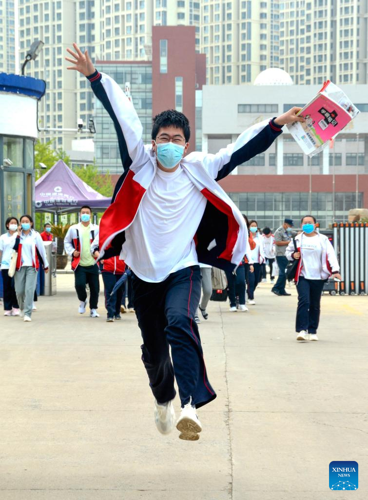 Examinees run out of an exam site of national college entrance exam in Luancheng District of Shijiazhuang, north China's Hebei Province, June 9, 2022. The annual exam, better known as the "gaokao," saw a record 11.93 million candidates signing up this year. (Photo by Li Mingfa/Xinhua)