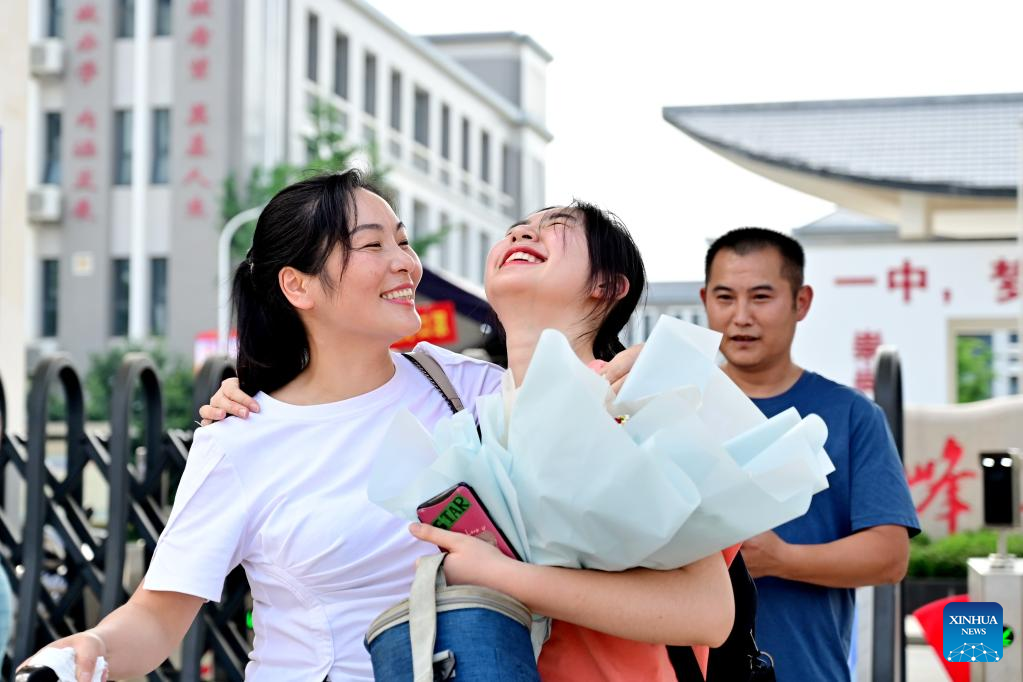 An examinee hugs her mother out of an exam site of national college entrance exam in Qinhuangdao City, north China's Hebei Province, June 9, 2022. The annual exam, better known as the "gaokao," saw a record 11.93 million candidates signing up this year. (Photo by Guo Nan/Xinhua)