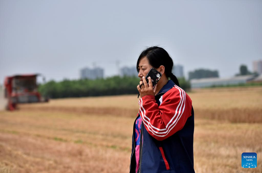 Dou Liping talks business on the phone in the wheat field at Hancun Village in Xingtai, north China's Hebei Province, June 9, 2022.