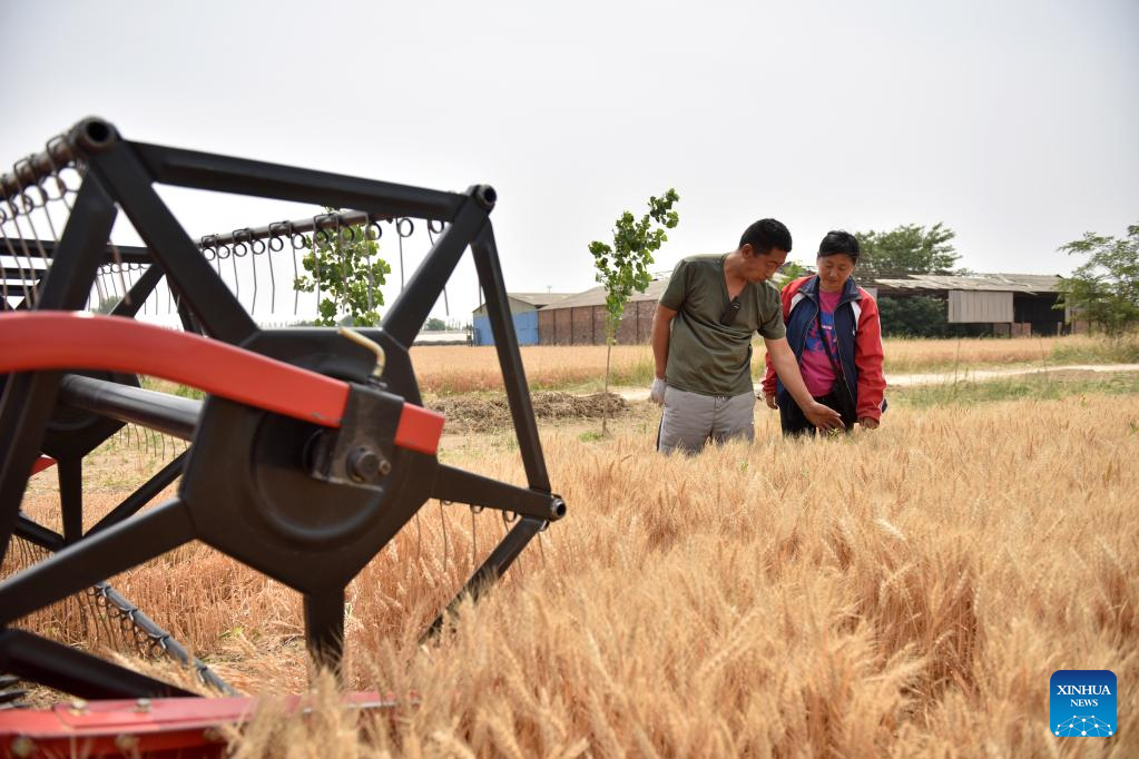 Tang Jumin (L) and Dou Liping check the wheat in the field at Hancun Village in Xingtai, north China's Hebei Province, June 9, 2022.