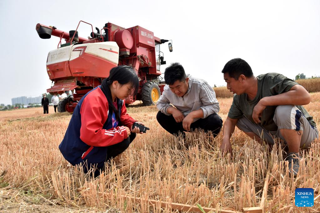 Tang Jumin (1st R) and Dou Liping (1st L) work with a villager in the wheat field at Hancun Village in Xingtai, north China's Hebei Province, June 9, 2022.