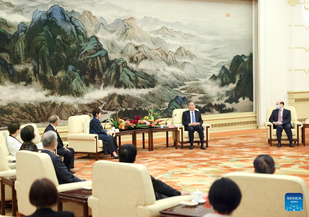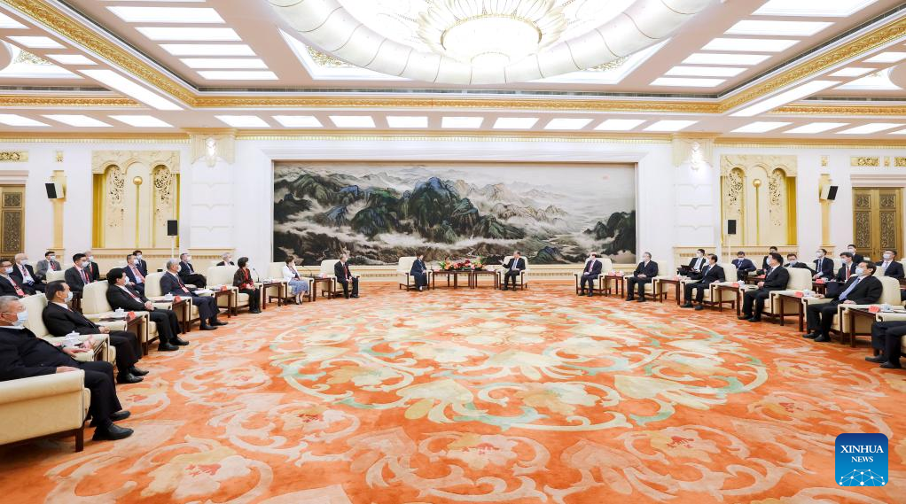 Wang Yang, a member of the Standing Committee of the Political Bureau of the Communist Party of China (CPC) Central Committee and chairman of the National Committee of the Chinese People's Political Consultative Conference, meets with Taiwan participants in a cross-Strait seminar with the theme of the rejuvenation of the Chinese nation in Beijing, capital of China, June 9, 2022. (Xinhua/Ding Haitao)