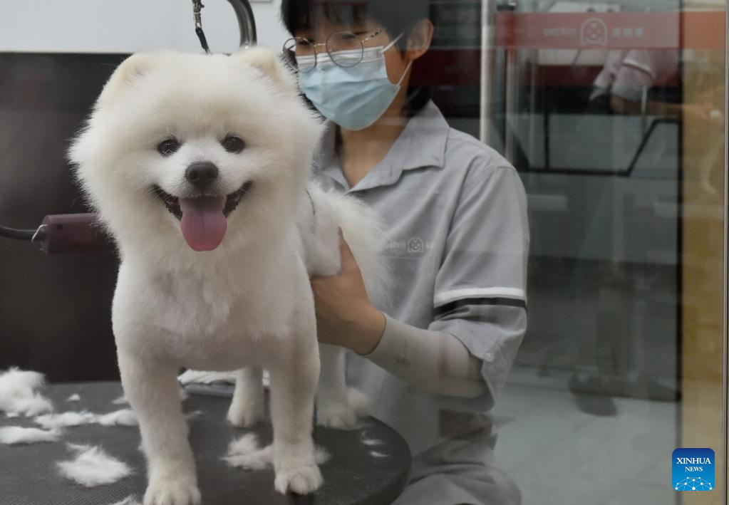 A staff member grooms a dog at a pet salon in Fengtai District, Beijing, capital of China, June 9, 2022.