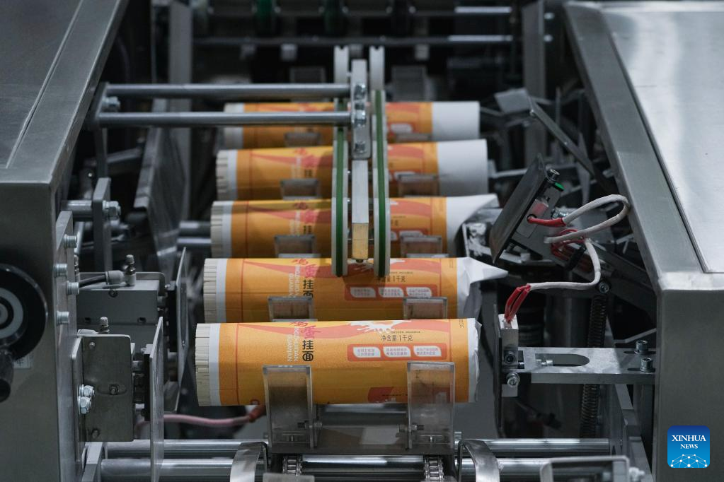 Packs of fine dried noodles are seen on the production line at a wheat processing plant in Woyang County of Bozhou City, east China's Anhui Province, June 7, 2022. (Xinhua/Du Yu)
