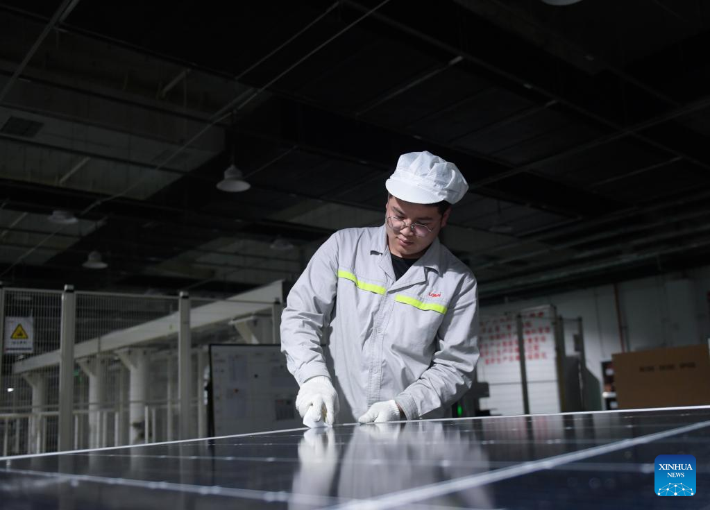 A staff member works at a photovoltaic modules manufacturer in Gonghe County of Hainan Tibetan Autonomous Prefecture, northwest China's Qinghai Province, June 7, 2022.