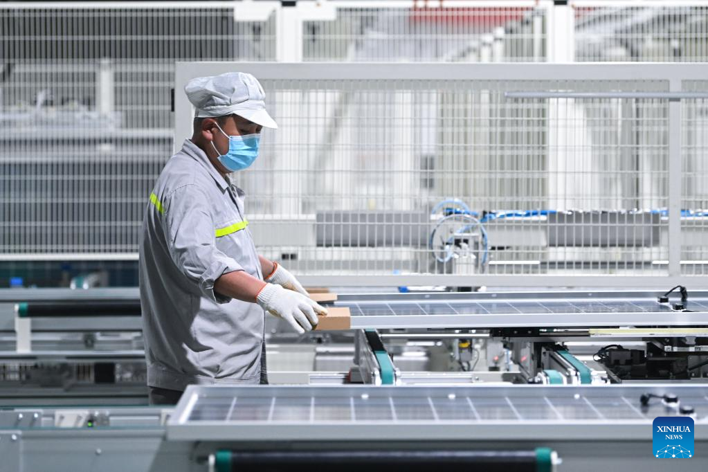A staff member works at a photovoltaic modules manufacturer in Gonghe County of Hainan Tibetan Autonomous Prefecture, northwest China's Qinghai Province, June 7, 2022.