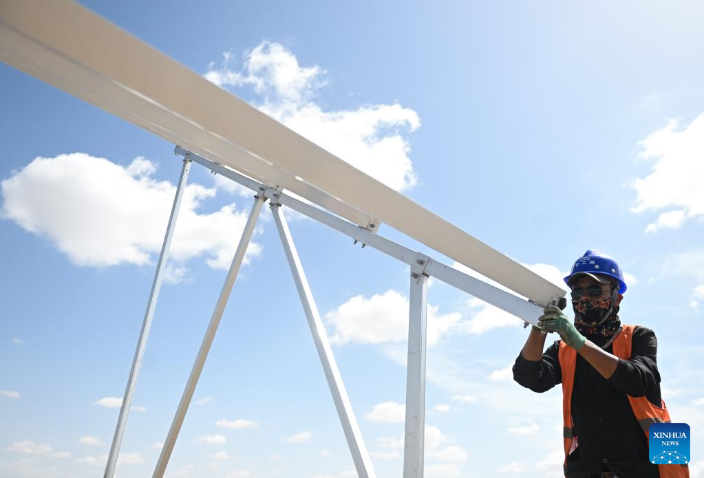 A staff member works at the construction site of a one million kilowatts photovoltaic project in Gonghe County of Hainan Tibetan Autonomous Prefecture, northwest China's Qinghai Province, June 8, 2022.