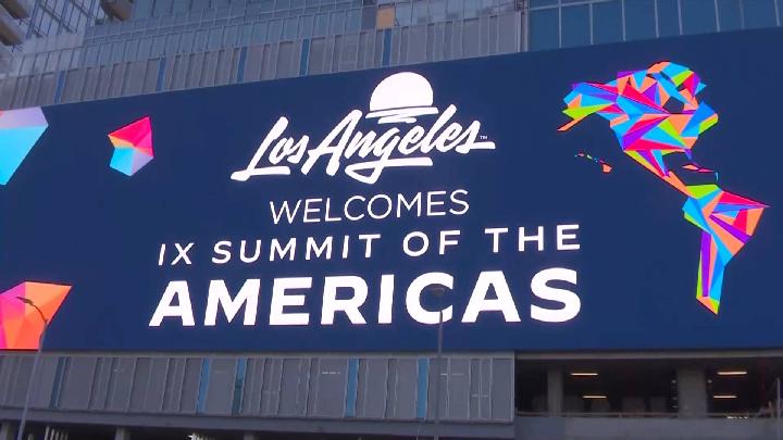 A video screenshot shows a poster of the 9th Summit of the Americas at the Los Angeles Convention Center in Los Angeles, California, the United States, June 9, 2022. (Xinhua)
