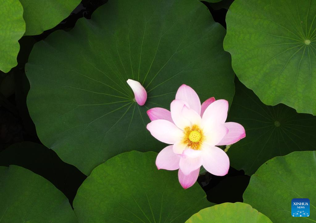 Aerial photo taken on June 12, 2022 shows a lotus flower in Yangzhou, east China's Jiangsu Province. (Photo by Meng Delong/Xinhua)