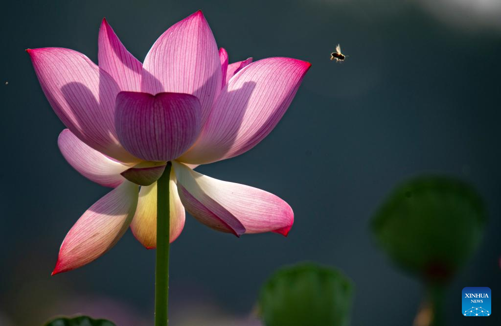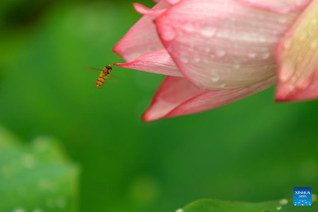 A bee approaches a lotus flower in Siping Village, Longshan County, Xiangxi Tujia and Miao Autonomous Prefecture, central China's Hunan Province, June 12, 2022. (Photo by Zeng Xianghui/Xinhua)