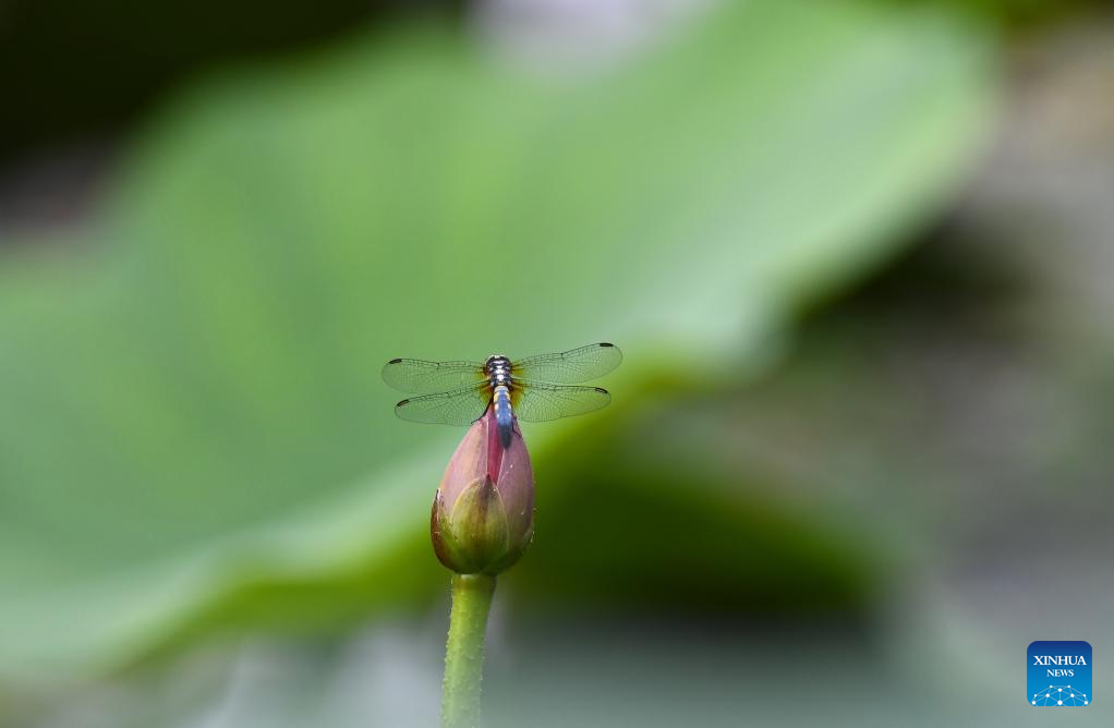 A dragonfly perches on a lotus bud in Tengzhou, east China's Shandong Province, June 12, 2022. (Photo by Li Zhijun/Xinhua)