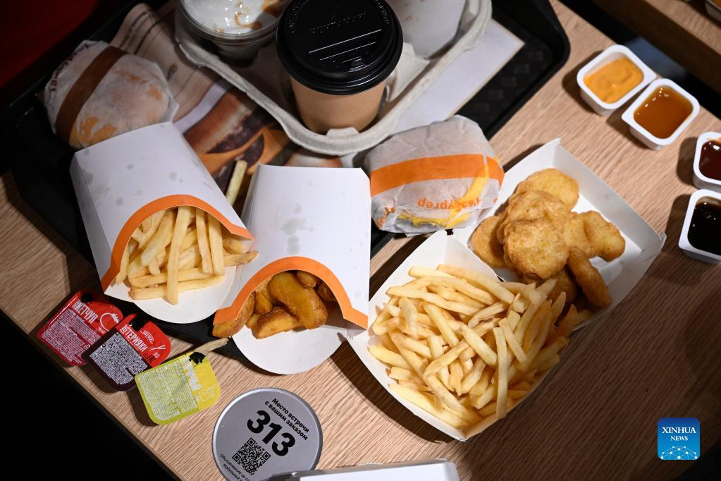 Food is seen on a table at the newly opened fast food restaurant in a former McDonald's outlet in central Moscow, Russia, on June 12, 2022. The successor to McDonald's in Russia, "Vkusno - i tochka," reopened the first batch of 15 restaurants in Moscow and its suburbs on Sunday, three months after the U.S. fast-food chain ended its business in Russia. (Photo by Alexander Zemlianichenko Jr/Xinhua)