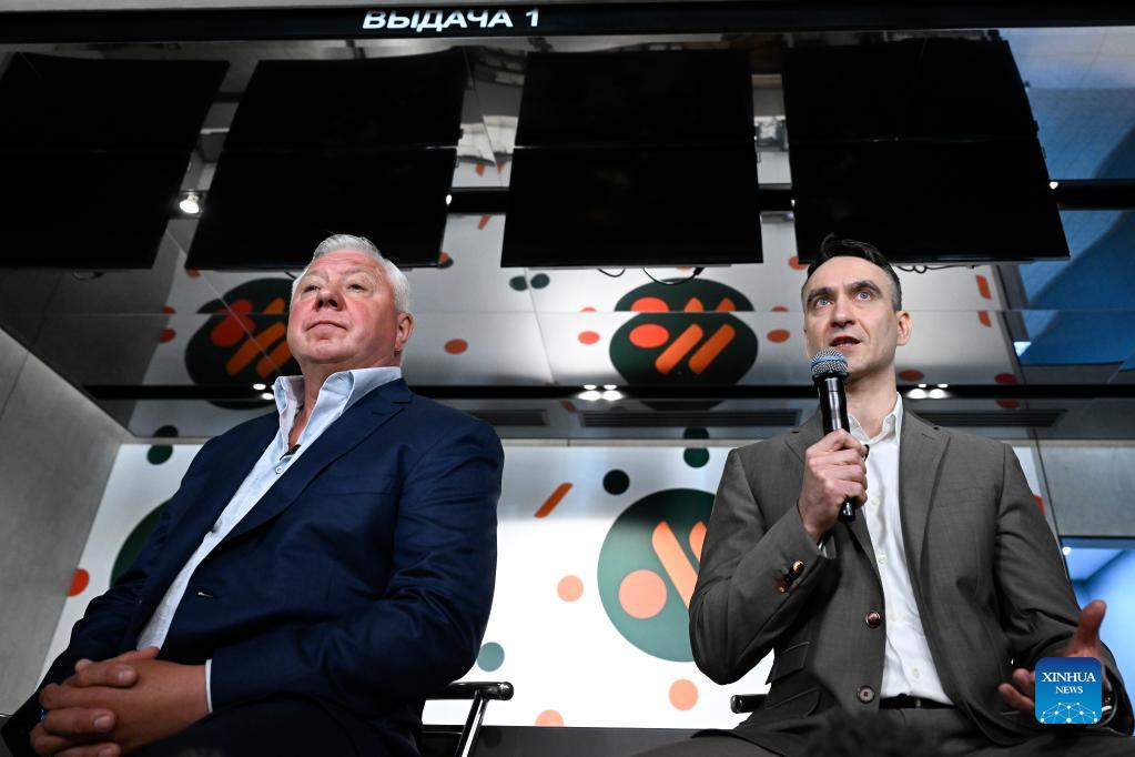 Oleg Paroev (R), general director of the "Vkusno - i tochka," and Russian businessman Alexander Govor attend a press conference prior to the opening of the fast food restaurant in a former McDonald's outlet in central Moscow, Russia, on June 12, 2022. The successor to McDonald's in Russia, "Vkusno - i tochka," reopened the first batch of 15 restaurants in Moscow and its suburbs on Sunday, three months after the U.S. fast-food chain ended its business in Russia. (Photo by Alexander Zemlianichenko Jr/Xinhua)