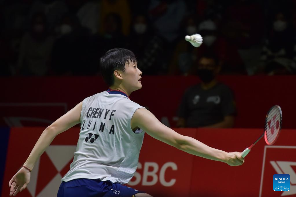 China's Chen Yufei hits a return during the women's singles final match against Thailand's Ratchanok Intanon at Daihatsu Indonesia Masters 2022 at the Istora Senayan sports stadium in Jakarta, Indonesia, June 12, 2022. (Xinhua/Veri Sanovri)