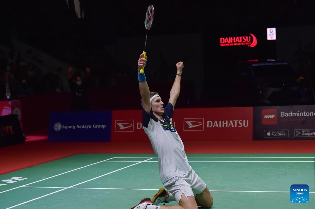 Viktor Axelsen of Denmark celebrates after winning the final of men's singles between Chou Tien Chen of Chinese Taipei and Viktor Axelsen of Denmark at Daihatsu Indonesia Masters 2022 at the Istora Senayan sports stadium in Jakarta, Indonesia on June 12, 2022. (Xinhua/Veri Sanovri)