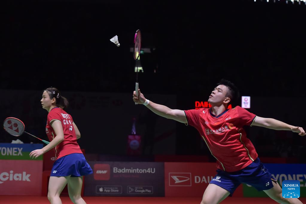 Zheng Siwei (R)/Huang Yaqiong of China compete during the final of mixed doubles match between Zheng Siwei/Huang Yaqiong of China and Thom Gicquel/Delphine Delrue of France at Daihatsu Indonesia Masters 2022 at the Istora Senayan sports stadium in Jakarta, Indonesia, on June 12, 2022. (Xinhua/Veri Sanovri)