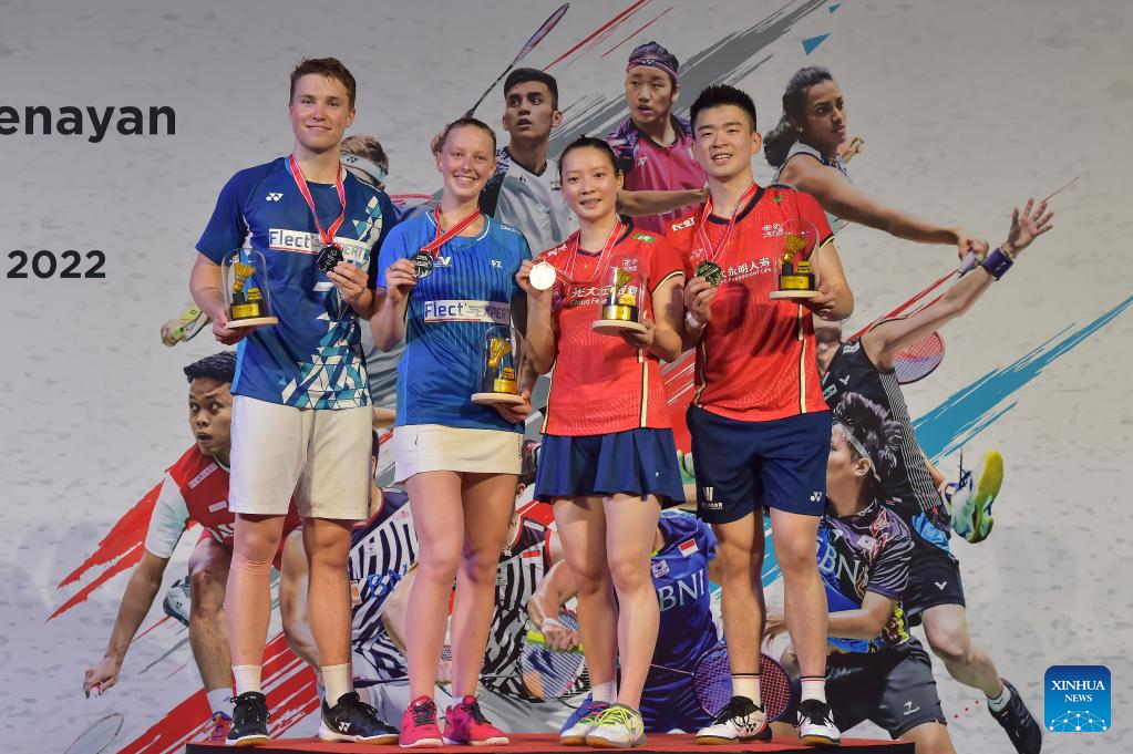 Thom Gicquel (L)/Delphine Delrue (2nd L) of France and Zheng Siwei (1st R)/Huang Yaqiong of China pose during the awarding ceremony after the final of mixed doubles match between Zheng Siwei/Huang Yaqiong of China and Thom Gicquel/Delphine Delrue of France at Daihatsu Indonesia Masters 2022 at the Istora Senayan sports stadium in Jakarta, Indonesia, on June 12, 2022. (Xinhua/Veri Sanovri)