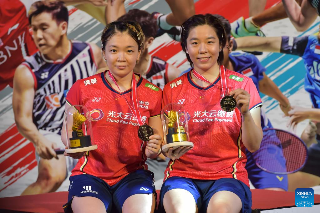 Chen Qingchen (L)/Jia Yifan of China pose during the awarding ceremony of the women's doubles final match at Daihatsu Indonesia Masters 2022 at the Istora Senayan sports stadium in Jakarta, Indonesia, June 12, 2022. (Xinhua/Veri Sanovri)