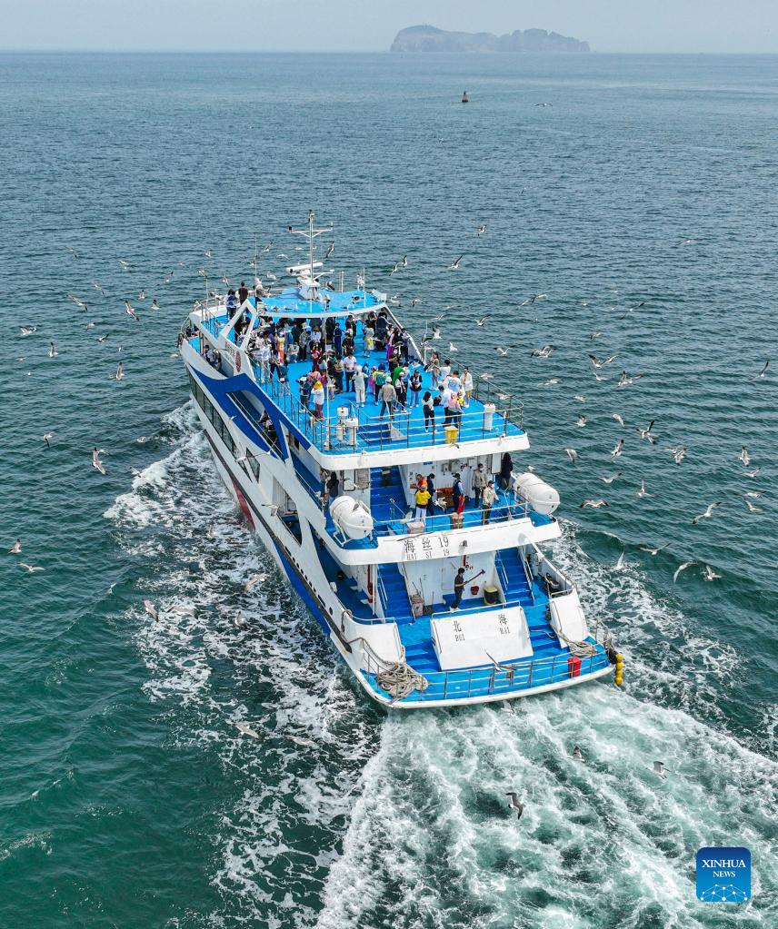 A colony of black-tailed gulls fly over the water in Rongcheng, east China's Shandong Province, June 12, 2022. (Photo by Li Xinjun/Xinhua)