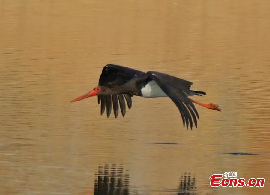 A black stork flies over Juma river , Laiyuan county, north China's Hebei Province, June 2022. (Photo: China News Service/Zhang Haibo)