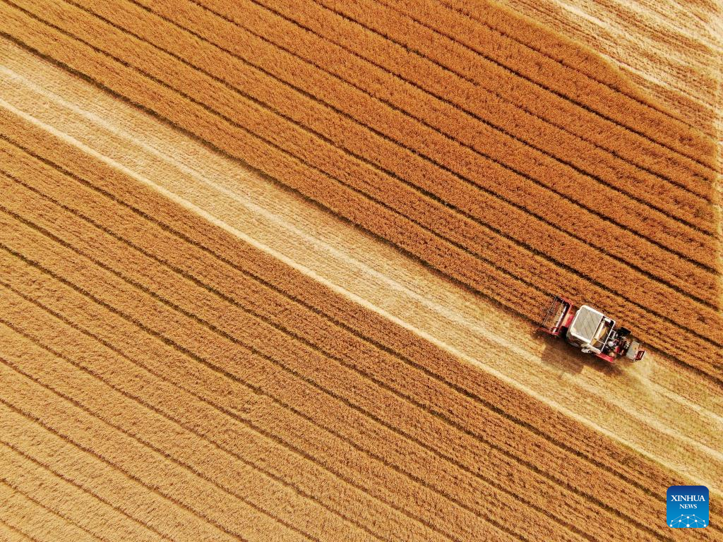 Aerial photo taken on June 12, 2022 shows a harvester working in the field in Dongjiazhuang Village of Difang Township in Pingyi County, Linyi City, east China's Shandong Province. By 5 pm this Monday, Shandong Province, China's second-largest wheat-producing area, had finished reaping winter wheat on 40.223 million mu (about 2.68 million hectares) of farmland, accounting for around 67 percent of its total winter wheat. (Photo by Wu Jiquan/Xinhua)