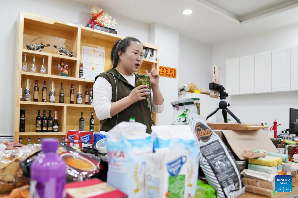A staff member introduces products on a livestream at Suifenhe Area of China (Heilongjiang) Pilot Free Trade Zone, June 10, 2022. (Xinhua/Wang Jianwei)