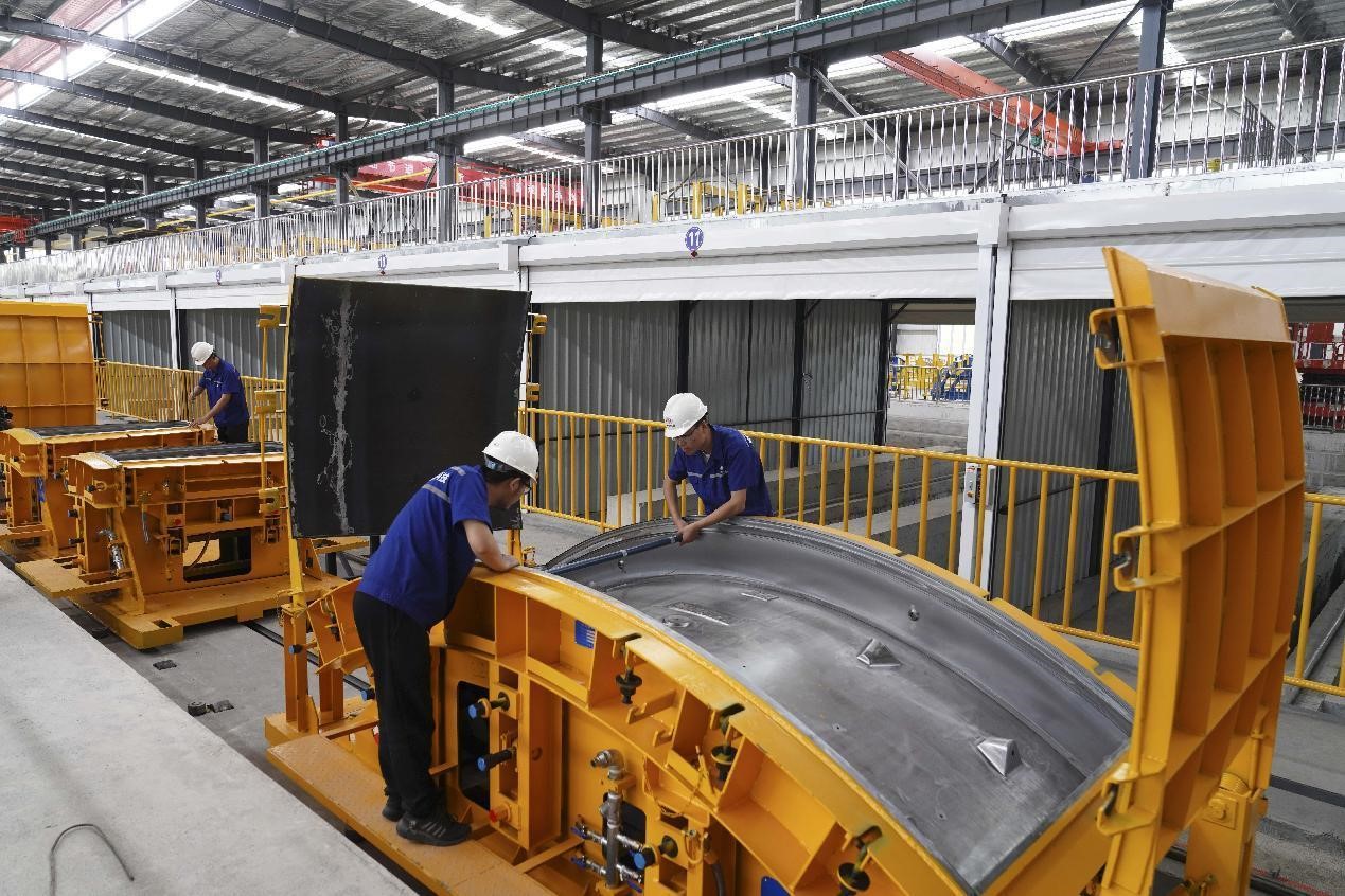Technicians examine the precision of subway tunnel segment mold at a green intelligent building industrial base of China Railway Construction Corporation Limited (CRCC) in Beibei district, southwest China’s Chongqing municipality, April 25, 2022. The industrial base uses modular prefabricated components and assembles them at construction sites, shifting tasks that were formerly performed on construction sites to factories. (People’s Daily Online/ Qin Tingfu)