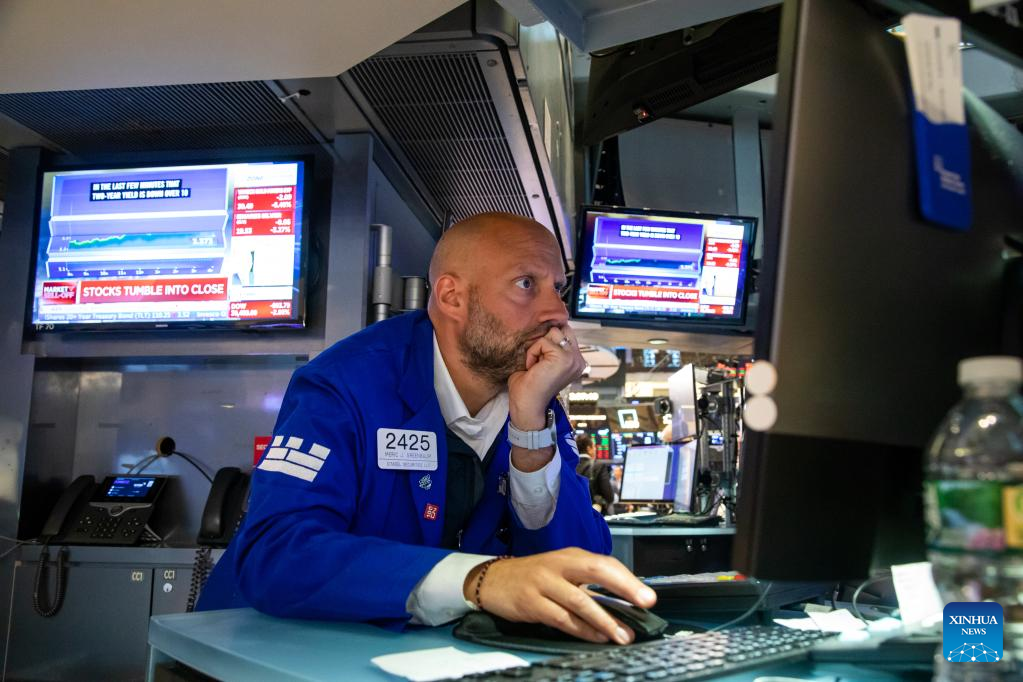 The Dow Jones Industrial Average tumbled 876.05 points, or 2.79 percent, to 30,516.74. The S&P 500 dropped 151.23 points, or 3.88 percent, to 3,749.63. The Nasdaq Composite Index shed 530.79 points, or 4.68 percent, to 10,809.23. (Photo by Michael Nagle/Xinhua)