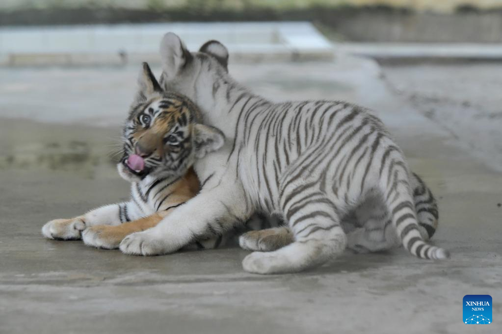 The cubs are now about two and a half months old, and still reliant on their mother's milk. (Xinhua)