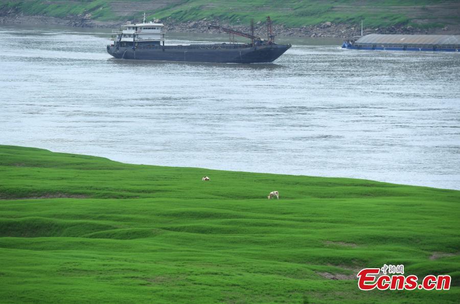 As the water level of the Yangtze River dropped, dense grass has grown in the water-level-fluctuation zone of the Yangtze River in Chongqing.