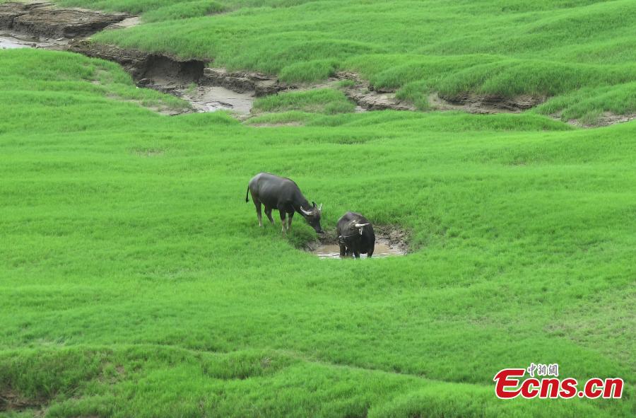 Cattle graze in the grass covered fluctuation zone of the Three Gorges Reservoir area in Fuling county, Chongqing, June 13, 2022. (Photo: China News Service/Chen Chao)