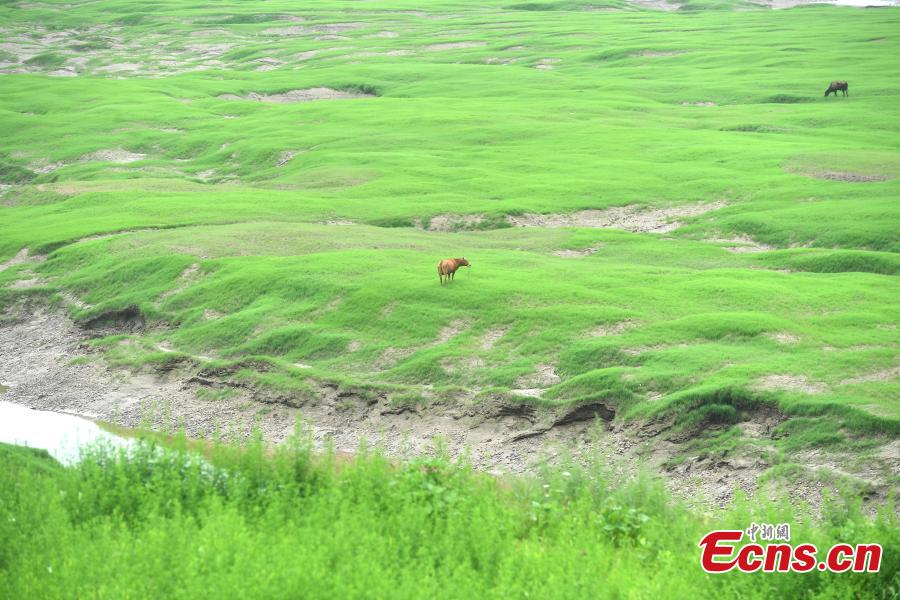 Scene of grass stretches in the water-level fluctuation zone of the Three Gorges Reservoir area in Fuling county, Chongqing, June 13, 2022. (Photo: China News Service/Chen Chao)