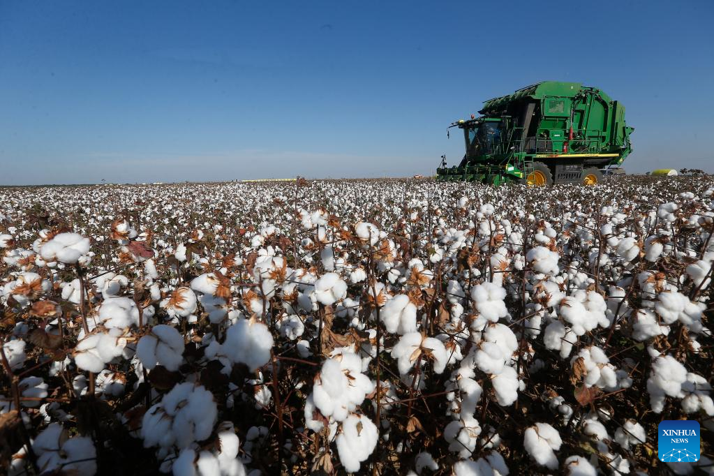 A machine collects cotton at Santa Colomba farm in Bahia state, Brazil, June 14, 2022. Brazil is one of the world's leading cotton producers and exporters. (Photo by Lucio Tavora/Xinhua)