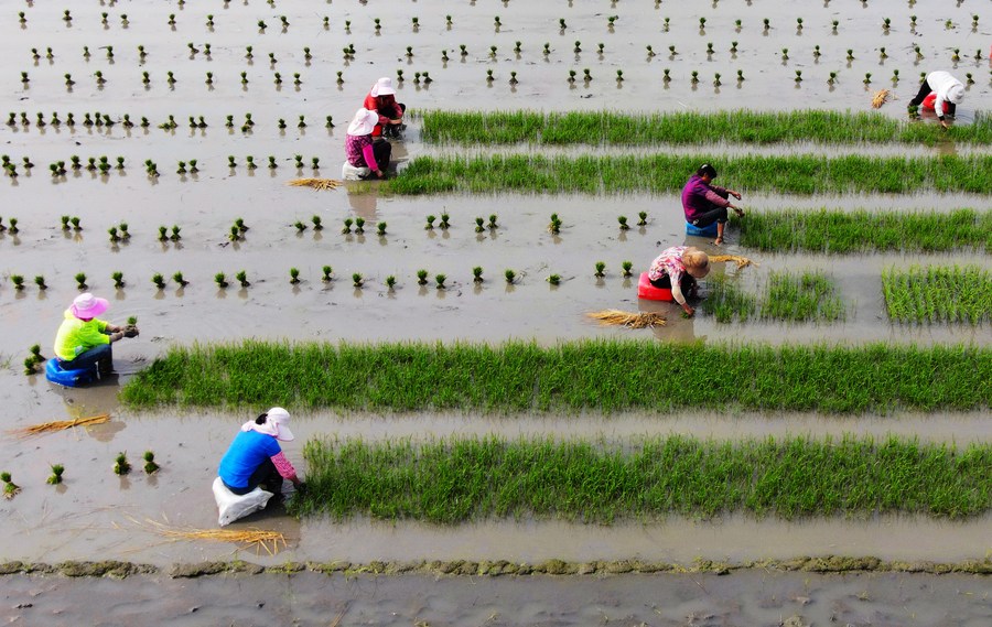 Aerial photo taken on June 13, 2022 shows farmers planting rice seedlings in an experimental field in Lixiahe area, east China's Jiangsu Province. (Photo by Meng Delong/Xinhua)