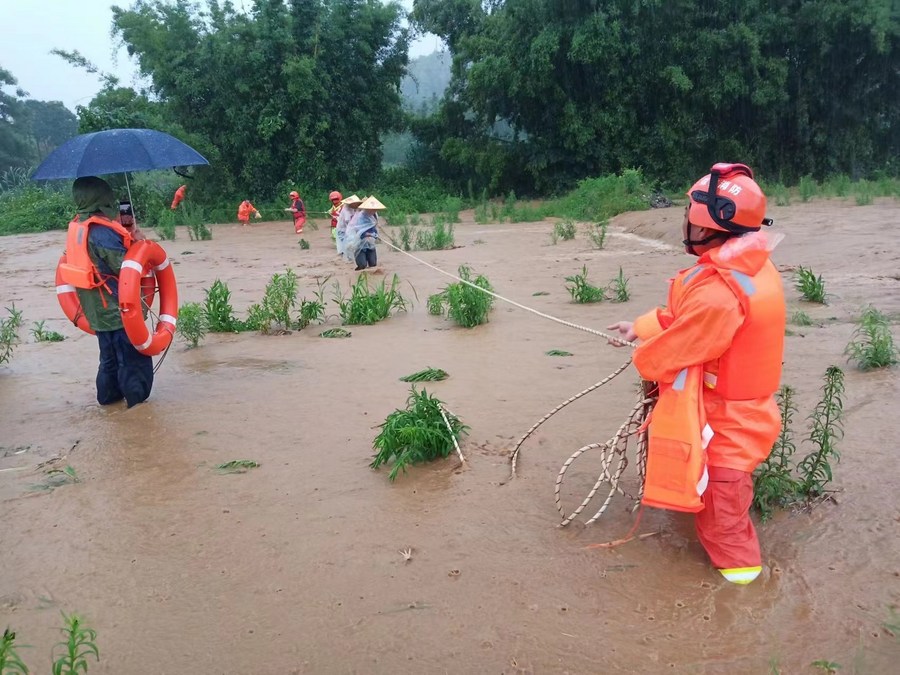 Photo taken with a mobile phone on June 13, 2022 shows rescue workers working in Dajishan Town of Quan'nan County in Ganzhou City, east China's Jiangxi Province. Heavy rain since Sunday had affected a total of 548,000 people in east China's Jiangxi Province as of 5 p.m. Tuesday, the provincial flood control headquarters said. Although the rain came to an end Wednesday, local meteorological department said further rainstorms are expected to hit parts of the province next week. (Xinhua)