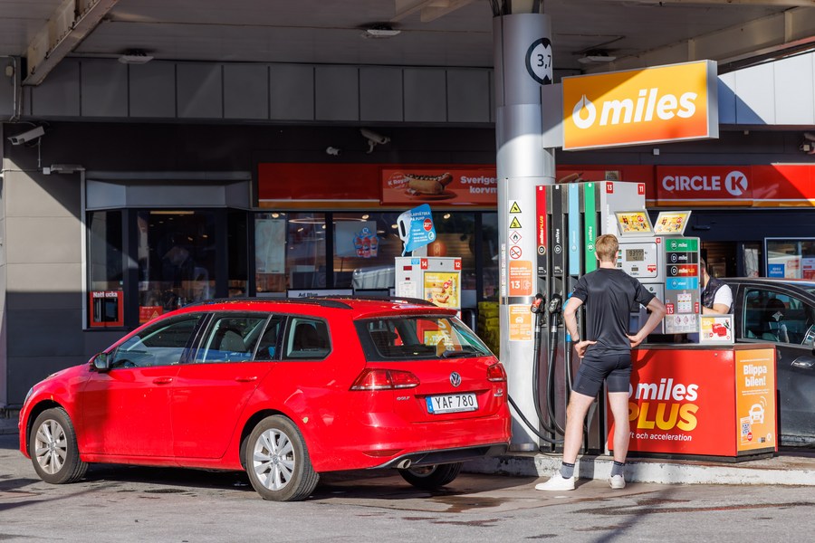 A man fuels a vehicle at a gas station in Stockholm, Sweden, on June 14, 2022. Swedish consumers are witnessing the highest inflation since 1991, with consumer prices, measured with a fixed interest rate, rising from 6.4 percent in April to 7.2 percent in May, Statistics Sweden said on Tuesday. (Photo by Wei Xuechao/Xinhua)