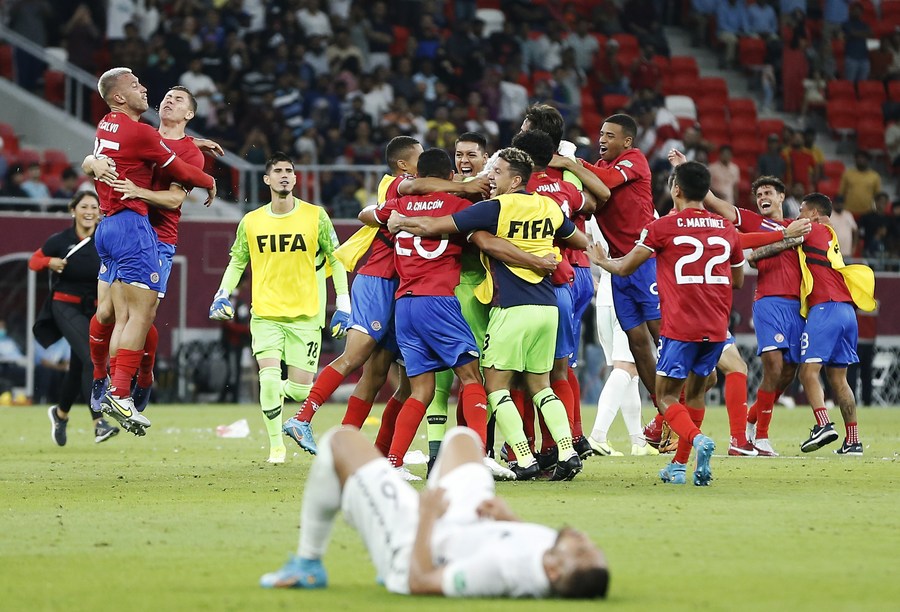 Players of Costa Rica celebrate after the FIFA World Cup 2022 intercontinental play-offs match between Costa Rica and New Zealand at the Ahmed bin Ali Stadium, Doha, Qatar, June 14, 2022. (Xinhua/Wang Dongzhen)