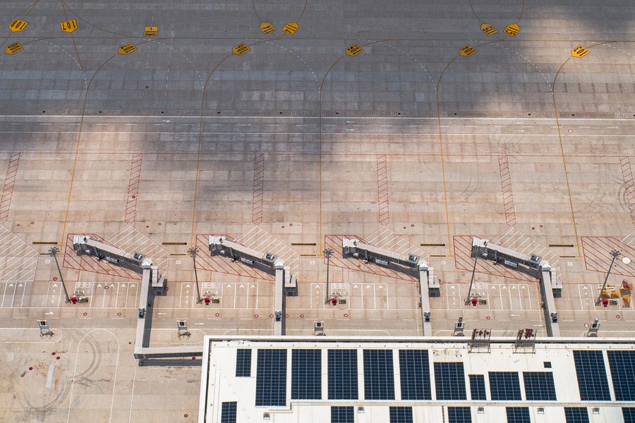 Aerial photo taken on June 14, 2022 shows a view of the Ezhou Huahu Airport in Ezhou, central China's Hubei Province. China's first cargo airport in the city of Ezhou has received industrial inspection recently and is expected to open to traffic soon. Equipped with two runway and taxiway systems and a freight transfer center spanning nearly 678,000 square meters, the airport will serve as an air cargo hub and feeder airport for passenger transport. (Xinhua/Xiao Yijiu)