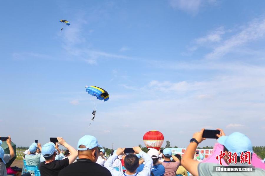 People watch parachuting performance during the 2022 Jiangxi Aviation Sports Tourism Festival in Ji'an, east China's Jiangxi Province, June 14, 2022. (Photo: China News Service/Liu Zhankun)