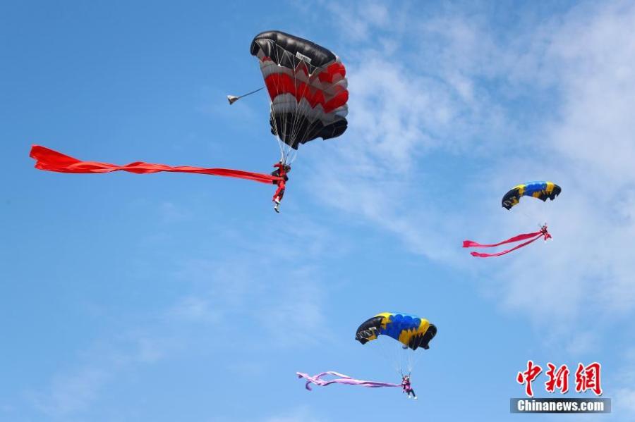 Women parachutists in traditional Chinese costumes perform during the 2022 Jiangxi Aviation Sports Tourism Festival in Ji'an, east China's Jiangxi Province, June 14, 2022. The festival opened on Tuesday in Jiangxi. (Photo: China News Service/Liu Zhankun)