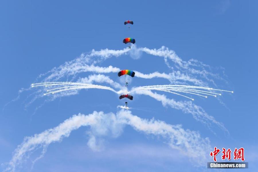 The dynamic parachute formation performs during the 2022 Jiangxi Aviation Sports Tourism Festival in Ji'an, east China's Jiangxi Province, June 14, 2022. (Photo: China News Service/Liu Zhankun)