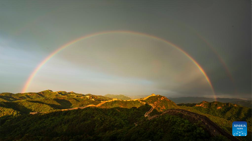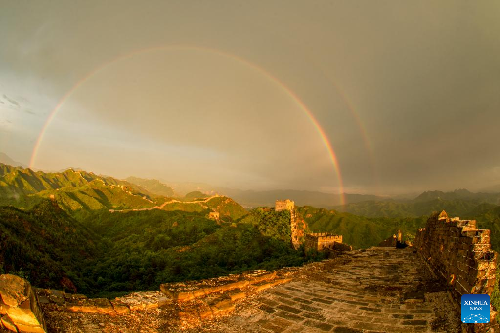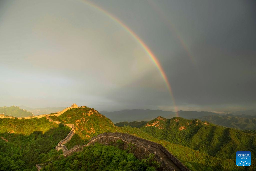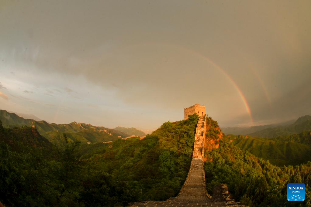 A double rainbow appears in the sky over the Jinshanling Great Wall in Luanping County, north China's Hebei Province, June 14, 2022. (Photo by Liu Mancang/Xinhua)