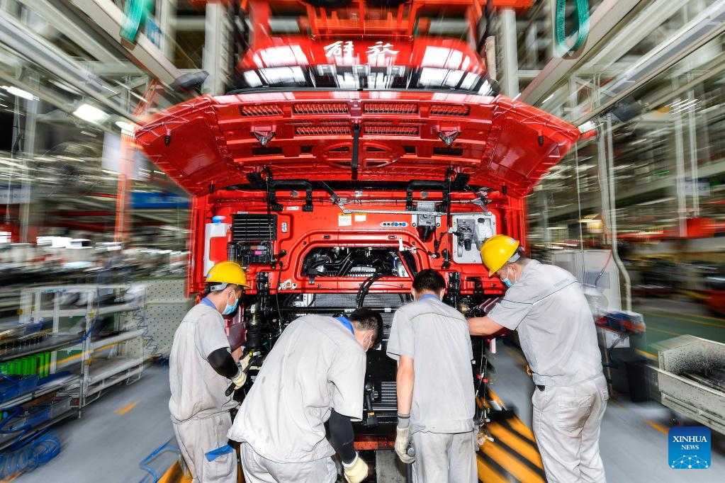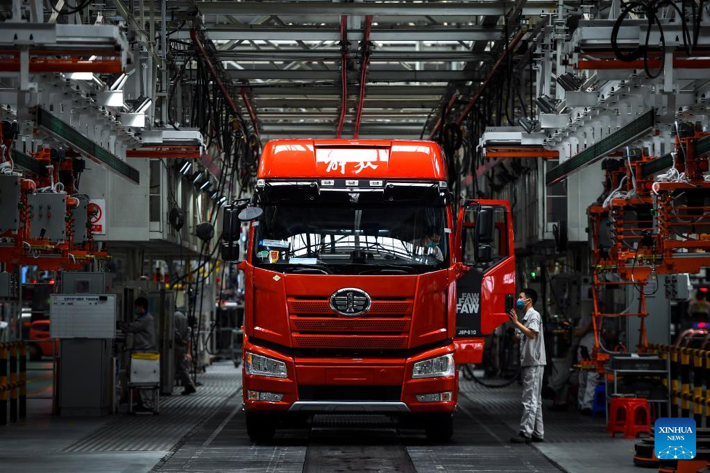 Employees work at an assembly line of FAW Jiefang truck in Changchun, northeast China's Jilin Province, June 15, 2022. (Xinhua/Xu Chang)