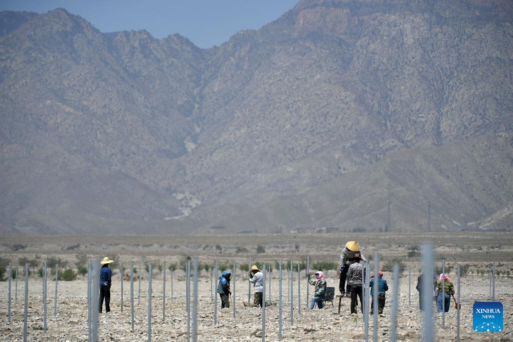 Workers put up grape trellis on the construction site of the Turandot Winery Town project in Yinchuan, northwest China's Ningxia Hui Autonomous Region, June 14, 2022.