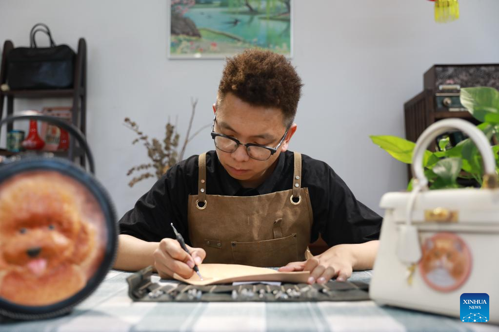 Wu, 34, has been focused on creating tailor-made leather objects carved with images of deceased pets. He is an inheritor of the intangible cultural heritage of Lianchi District, Baoding city, north China's Hebei Province.