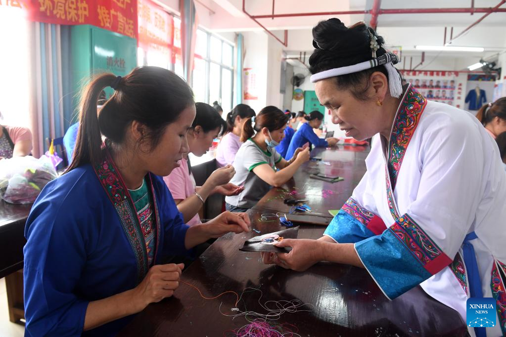 Women learn embroidery at a training class in Guyi Township of Sanjiang Dong Autonomous County, south China's Guangxi Zhuang Autonomous Region, June 16, 2022. Recently local authorities of Sanjiang have organized multiple skill training classes as a way to boost employment and improve locals' incomes. (Xinhua/Lu Boan)