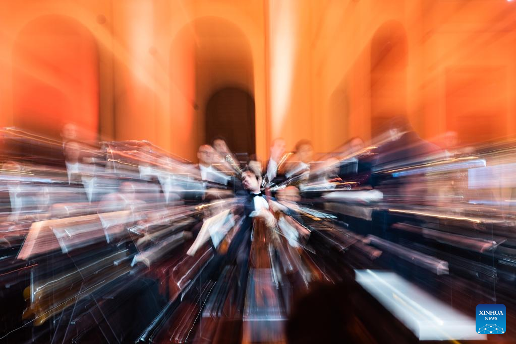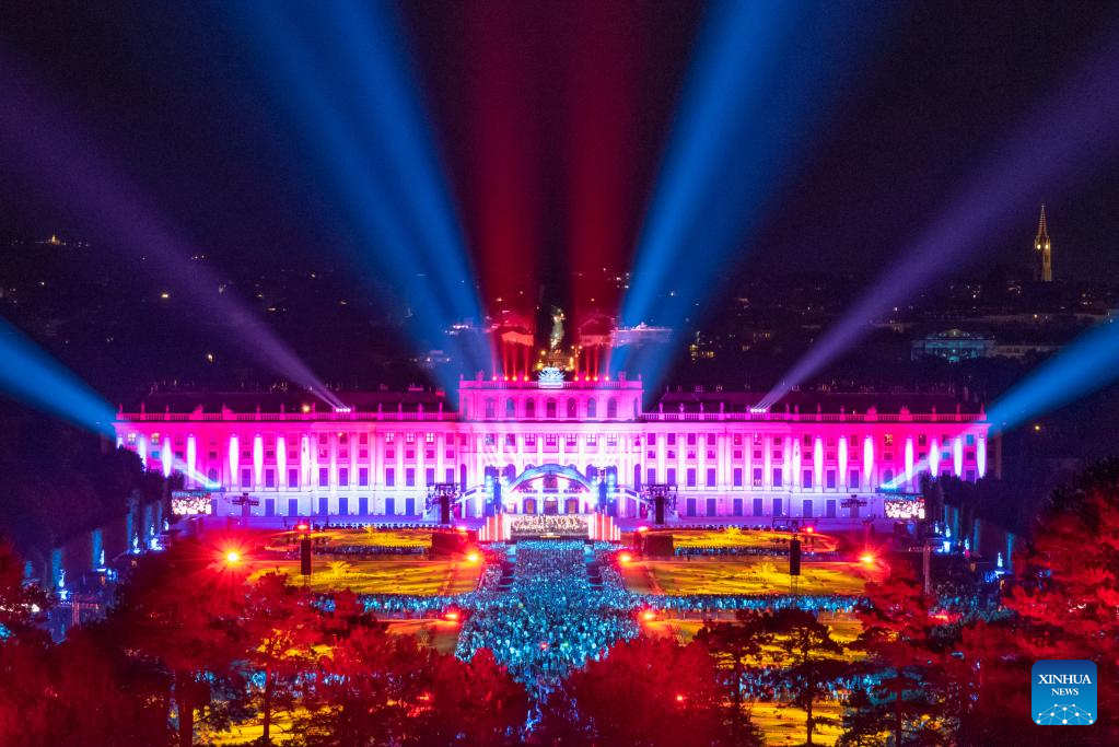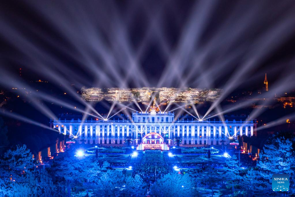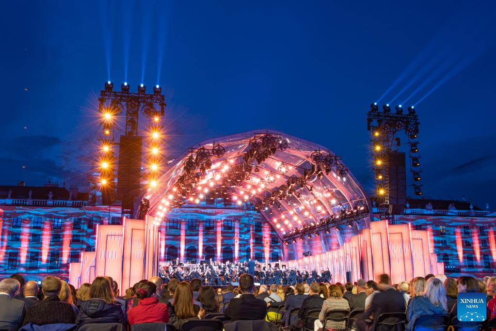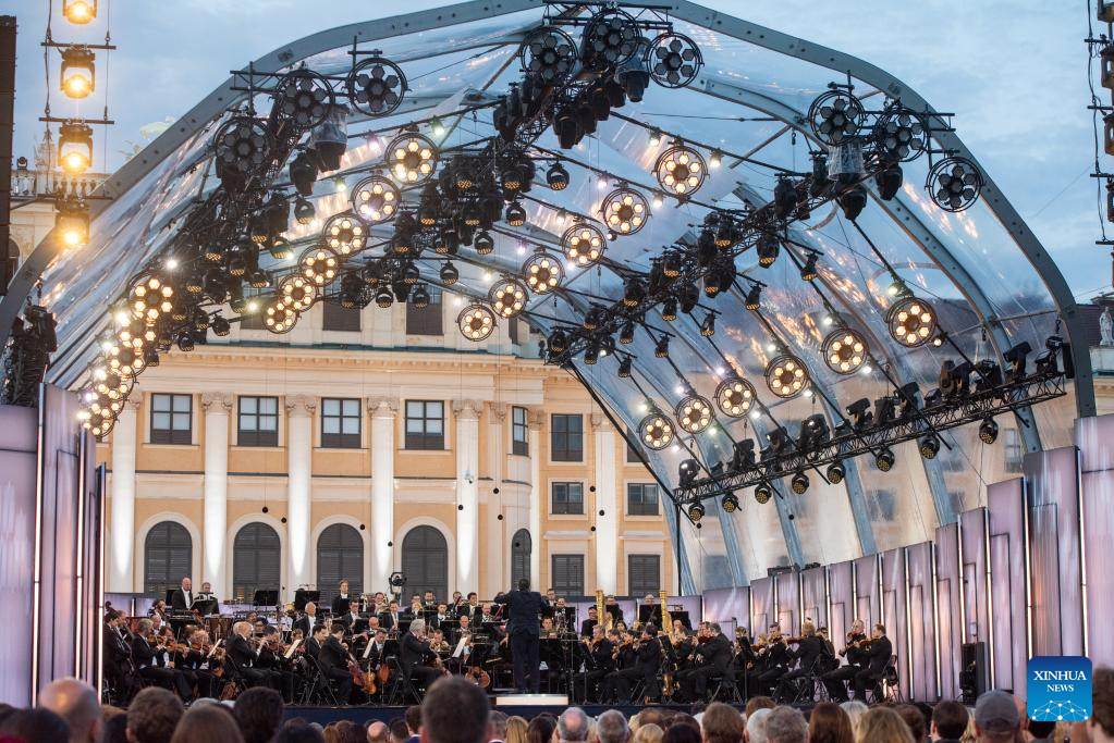Members of the Vienna Philharmonic perform during the Summer Night Concert at the park of Schoenbrunn Palace in Vienna, Austria, on June 16, 2022. The Summer Night Concert 2022 was staged here by the Vienna Philharmonic on Thursday. (Xinhua/Guo Chen)