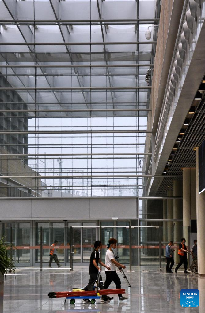 Workers are seen at Beijing Fengtai Railway Station, which will be put into service soon, in Beijing, capital of China, June 16, 2022. (Xinhua/Li Xin)