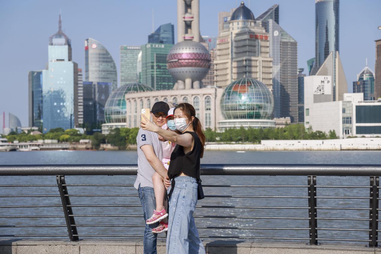 Tourists take selfies at the Bund overlooking the financial district of Lujiazui of Shanghai, June 2, 2022. (Photo by Wang Chu/People’s Daily Online)